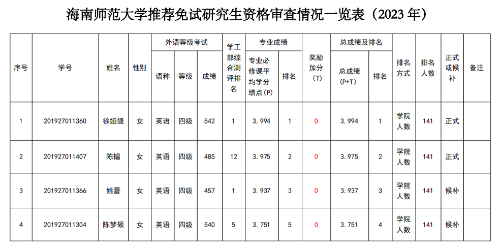 根据《海南师范大学关于做好推荐2023年应届优秀本科毕业生免试攻读硕士学位研究生工作》的通知要求,从专业课成绩(师范类专业含教师教育必修)平均学分绩点、学工部综合测评等方面对2019级拟审报推免学生进行资格审查,同时审核全国大学英语四级考试成绩、无不及格课程和无违纪等情况。经过条件资格审核,共有15名学生符合推免条件。其中有9名学生自愿放弃推免,并提交了放弃推免的声明。另有徐娅婕、王佳琪、袁欣、陈梦硕四位学生申请加分答辩,通过院里五位专家的现场评审,根据学校文件,均不符合,不予以奖励加分。现将学院推免生工作小组对符合推免生条件结果予以公示。根据学校规定,我院共有2个名额,将以1:2的比例要求报送4名学生。公示:2022年9月14日至2022年9月19日,请有异议的同学在这之间反馈,联系人:代佩,13707510601。