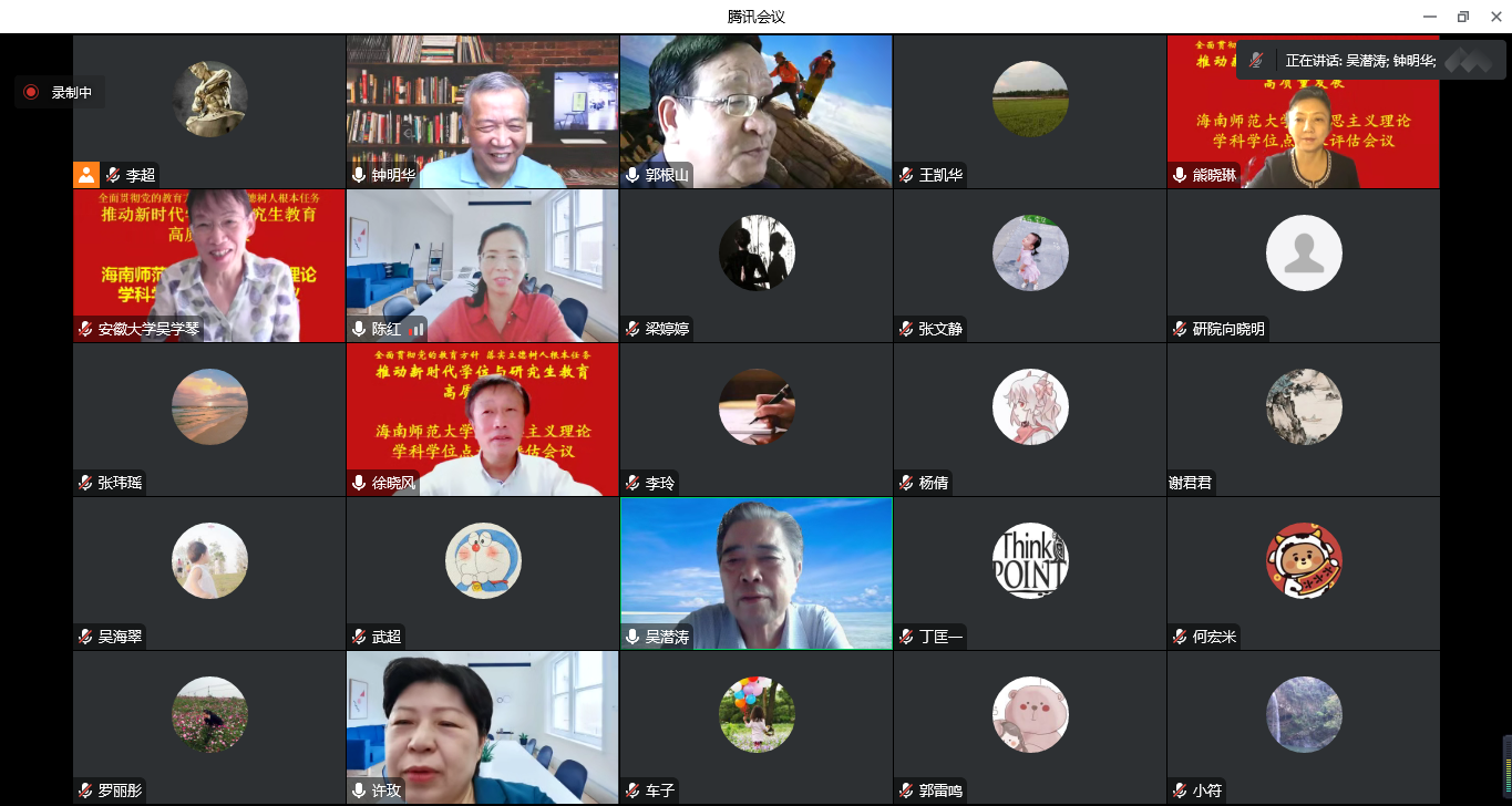 2022年9月30日上午9时,海南师范大学马克思主义理论学科学位授权点通过线上腾讯会议形式召开周期性合格评估同行专家评议会。评议专家组由清华大学吴潜涛教授(评议组组长)、中山大学钟明华教授、哈尔滨师范大学徐晓风教授、北京师范大学熊晓琳教授和安徽大学吴学琴教授等5人组成。海南师范大学党委副书记(主持党委工作)许玫同志与会指导,参加会议的还有研究生学院负责同志、马克思主义学院领导班子成员、学科方向负责人、各教研室主任、行政教辅人员及在读硕博研究生。会议由马克思主义理论学科带头人郭根山教授主持。