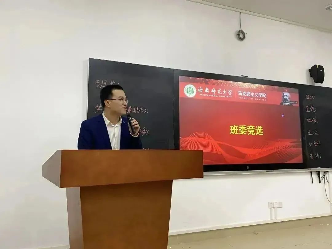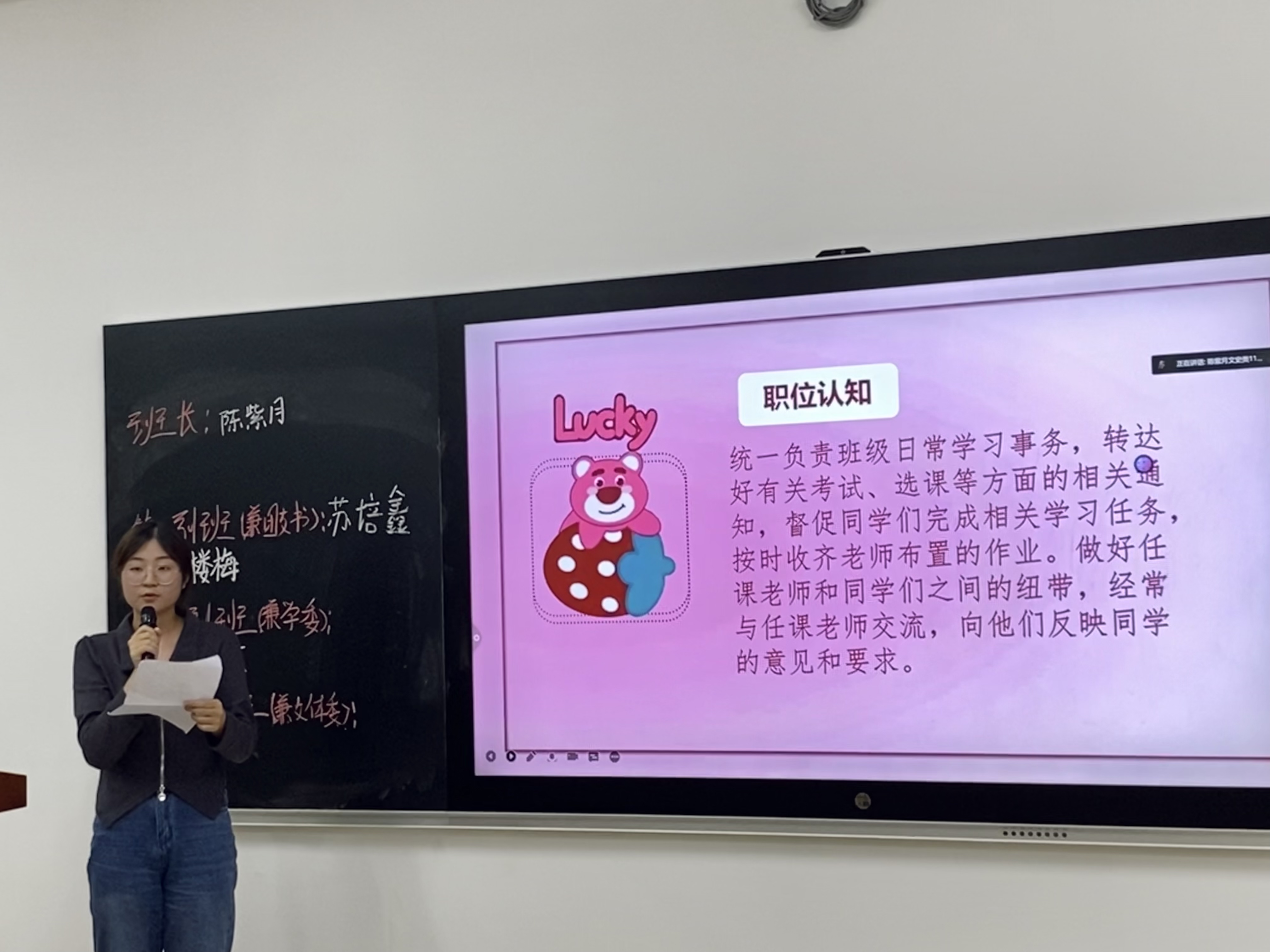 在自我介绍环节,新生按照座位顺序依次登台,介绍个人的籍贯、爱好和理想等内容,以让其他同学对自己有更深入的认识。在班委竞选环节,新生积极参加,参选人数超过总人数的三分之一,参选同学用PPT介绍了自己的竞选岗位、竞选动机和未来展望等方面的内容。在教师寄语环节,武超老师寄语新生,希望大家未来能做到以下方面:一是强身健体、积极乐观;二是知行合一、学思结合;三是相互尊重、友好相处。