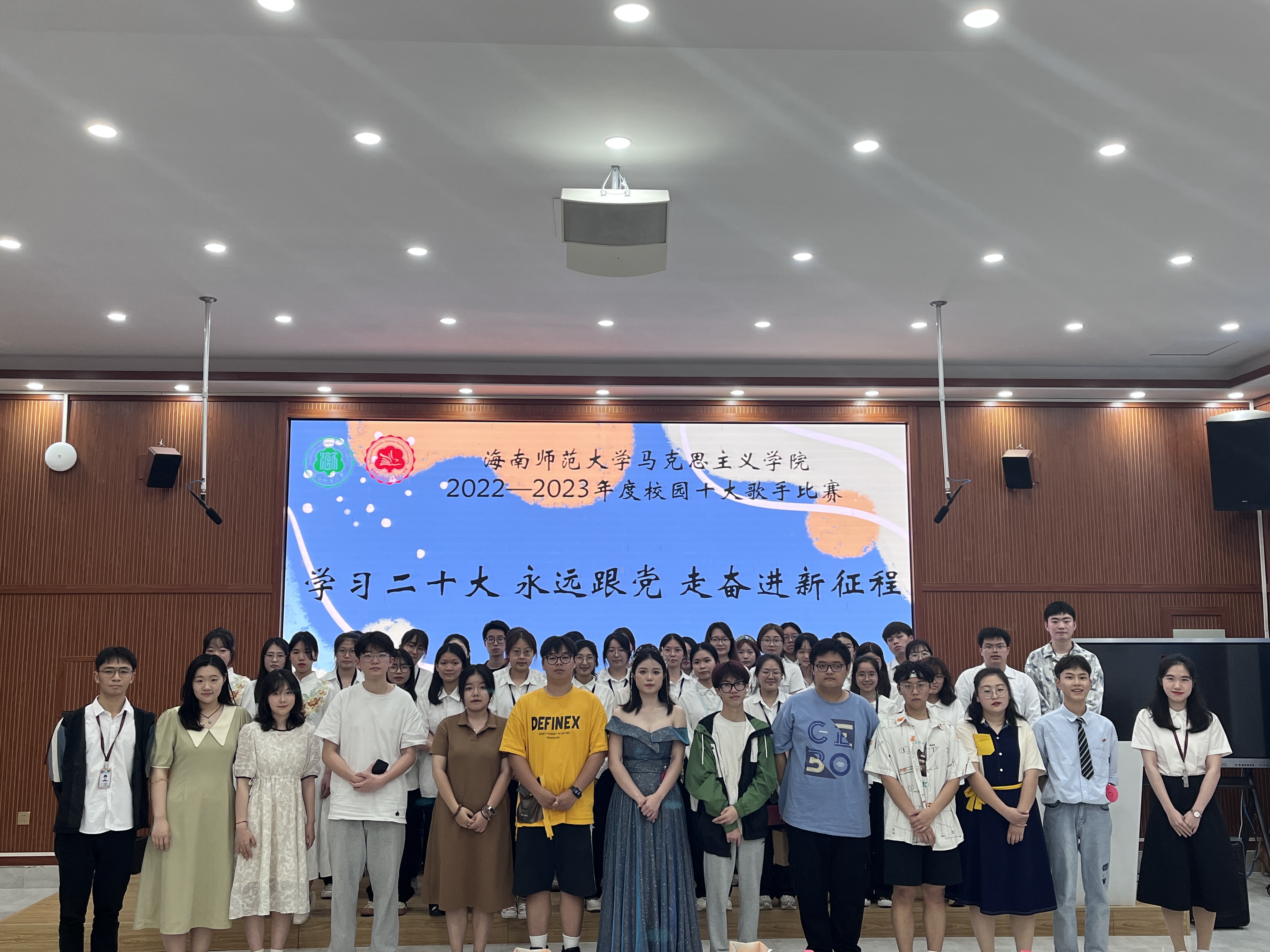 为了学习宣传并贯彻党的二十大精神,丰富校园文化生活,展现我院学子的青春热情,海南师范大学马克思主义学院于2023年4月2日下午在马院201报告厅举办了主题为“学习二十大,永远跟党走,奋进新征程”的校园十大歌手大赛。音乐学院文艺体育部部长张文,爱奇艺Beatshome入驻制作人张明宇,厦门六中合唱团成员吴裕宸,马克思主义学院团委副书记刘思琪,学生会执行主席姚鑫玥、学生会主席团成员卢智翔,青年志愿者协会会长姜雨卓出席本次活动。