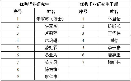 根据海南师范大学研究生学院《关于评选海南师范大学2023届优秀毕业研究生及优秀毕业研究生干部的通知》(海师研函〔2023〕44号)文件要求,结合我院实际,经毕业生自主申报、指导教师推荐、学院评审小组评审,拟推荐朱献苏等9名优秀毕业研究生、林君怡等7名优秀毕业研究生干部,具体名单附后。
