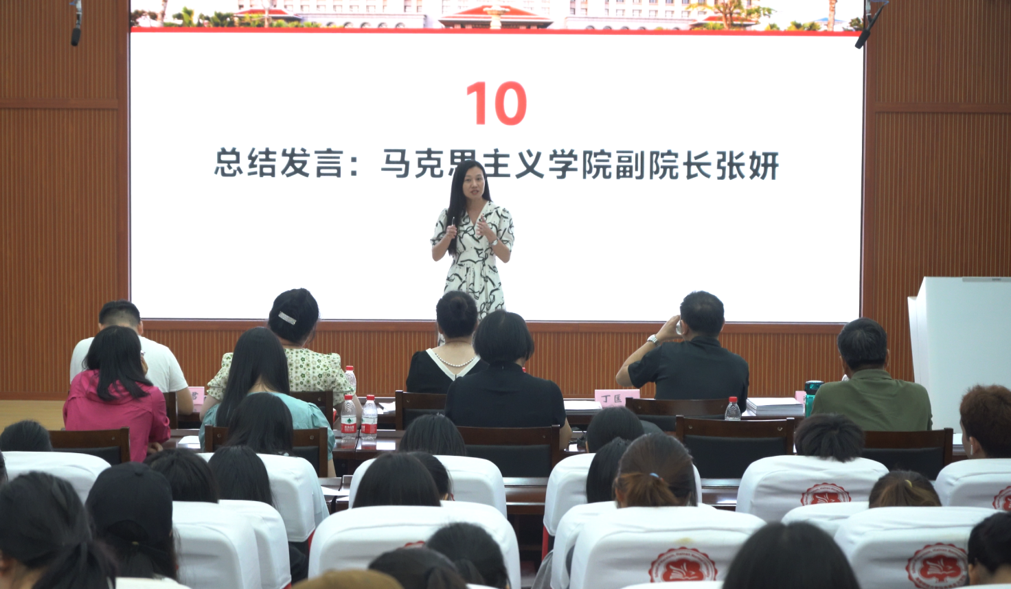 微课展播评选活动暨颁奖典礼由海南师范大学文学院21中文2班的何东宸和21中文4班的李金颖主持。在依次对获奖作品进行展播和颁奖后,由马克思主义学院副院长张妍进行总结点评。张妍强调了《习近平新时代中国特色社会主义思想概论》课程在高校思政课体系中的重要地位,肯定了习近平新时代中国特色社会主义思想教研室教研室的教学创新探索,对后续进一步完善微课评比活动内容、形式、体制机制方面提出了宝贵的建议。