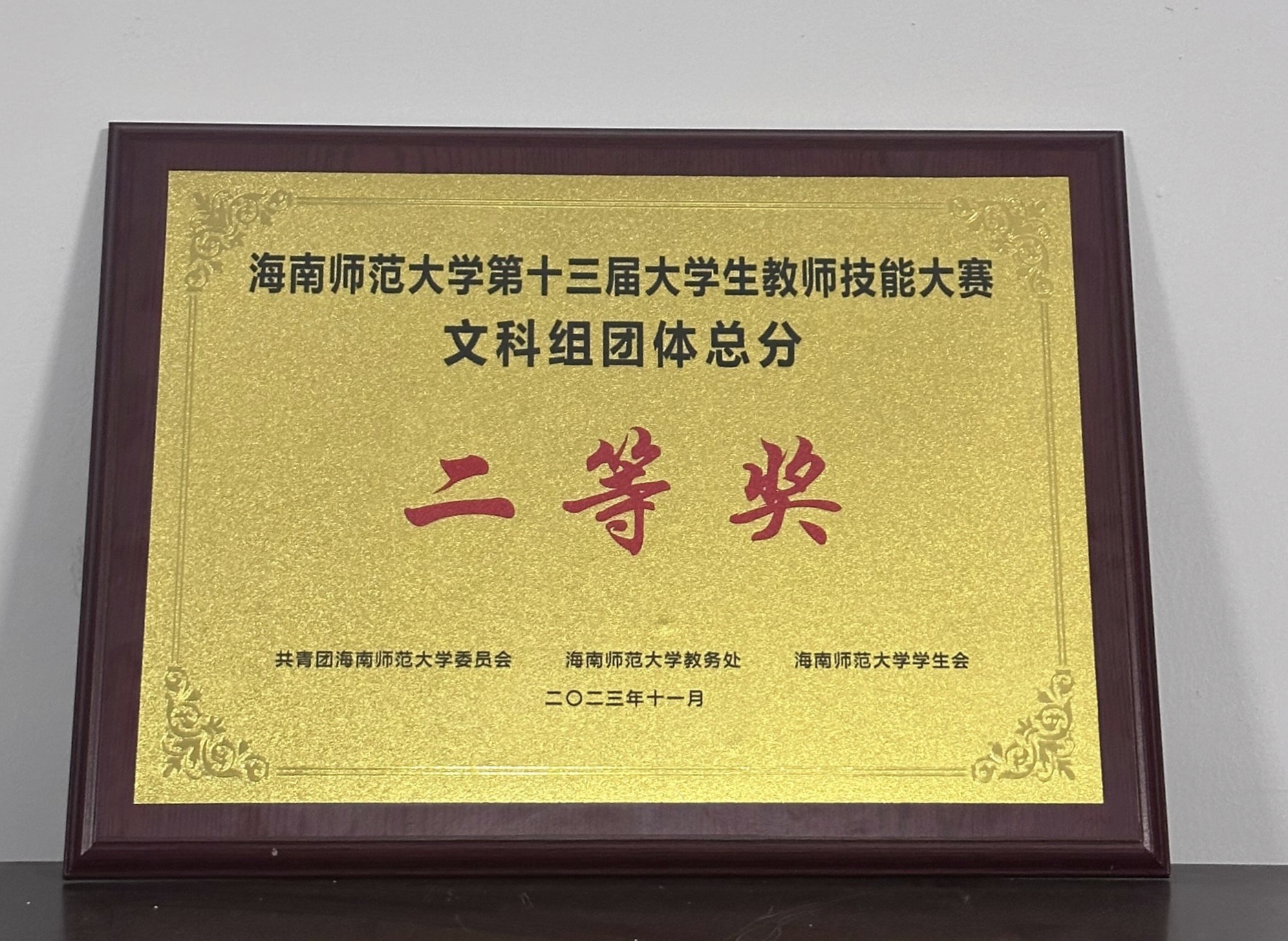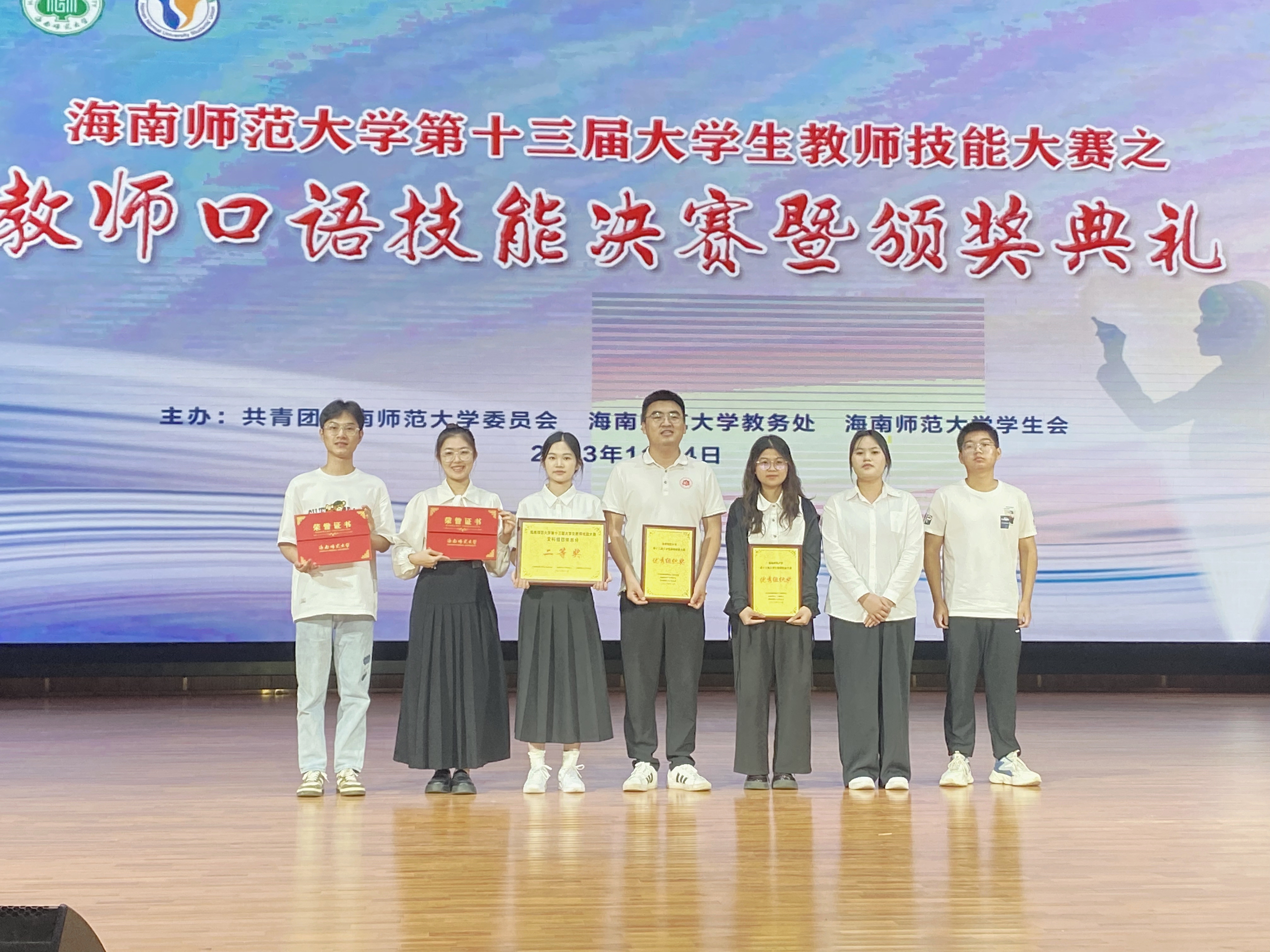 为充分展现新时代新征程高质量教师队伍建设的突出成就和广大教师立德树人、自信自强的精神风貌,创设“以赛促教,以赛促学,以赛促改”的交流学习平台,切实提高我校大学生的教师职业意识和职业能力,营造学习、竞争、提高的浓厚氛围,海南师范大学于10月11日——11月4日举办了第十三届大学生教师技能大赛,张子扬、郭慧、吕雨婷、梁乙佳、符夏虹、王艺珈六名同学代表马克思主义学院参与了本次决赛,最终取得了文科组团体总分二等奖的优异成绩。