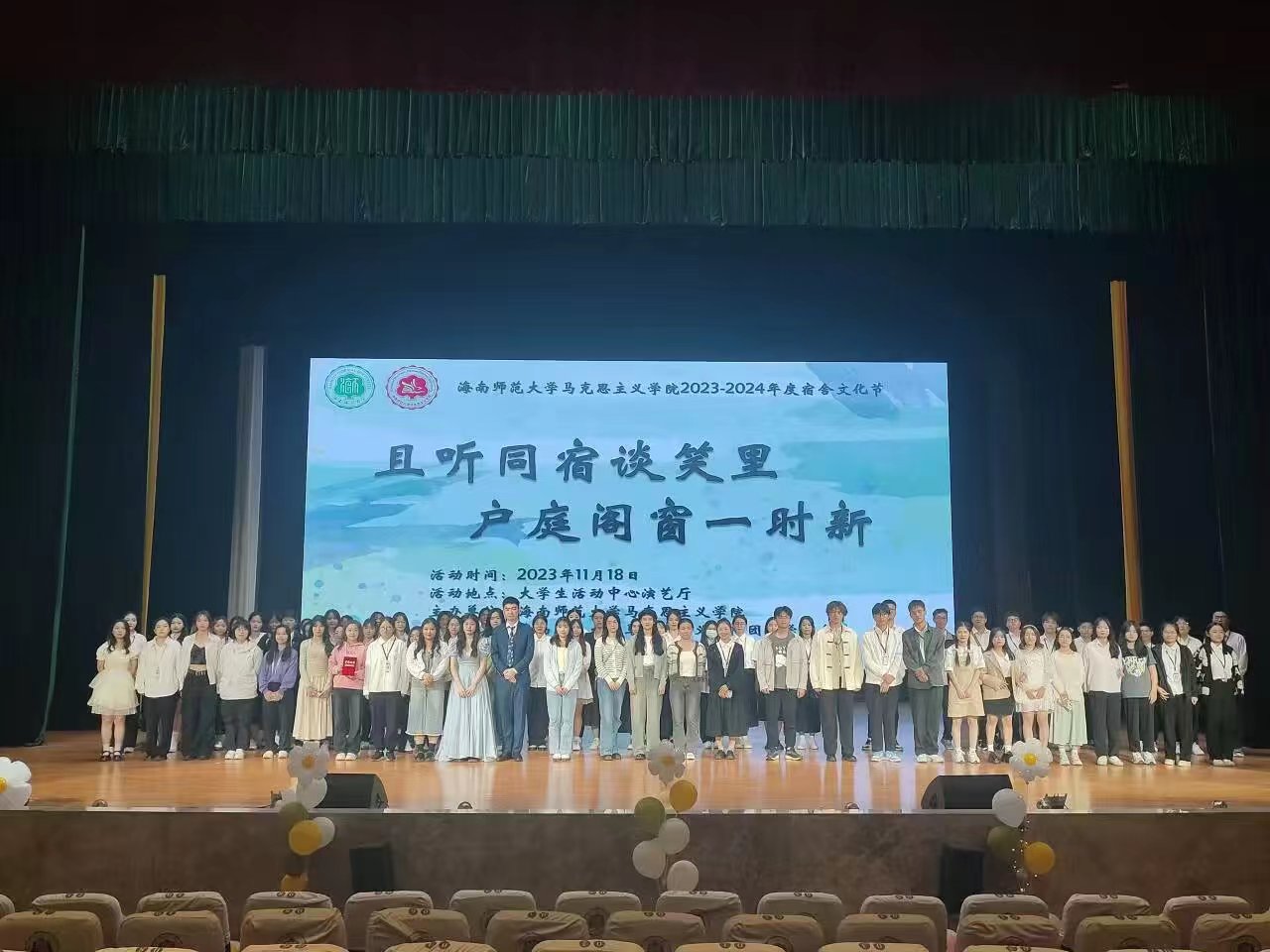 为营造和谐的宿舍氛围,增进宿舍成员间的友谊与默契,强化宿舍的团结凝聚力,创造美好的生活空间,海南师范大学马克思主义学院于2023年11月18日19:30在大学生活动中心演艺厅隆重举行以“且听同宿谈笑里,户庭阁窗一时新”为主题的宿舍文化节活动。