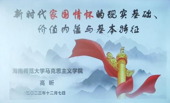 2023年12月8日,海南师范大学马克思主义学院于第一公共楼504公共教室成功举办了一场以“新时代家国情怀的现实基础、价值内蕴与基本特征”为主题的讲座。
