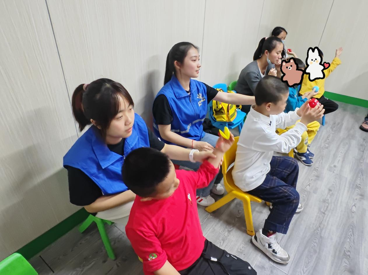 13:00,10名志愿者到达目的地。在基地工作人员讲解完相关注意事项后,各志愿者在老师的安排下去往各班协助教学。针对自闭症儿童的特点及特殊需求,开展了蒙氏教育、社交与游戏、生活技能等课程。志愿者的服务内容围绕“助教、陪护、感召”三步走,在课堂及课余时间陪伴自闭症儿童,给予“星星的孩子”如沐春风的爱与关怀。
