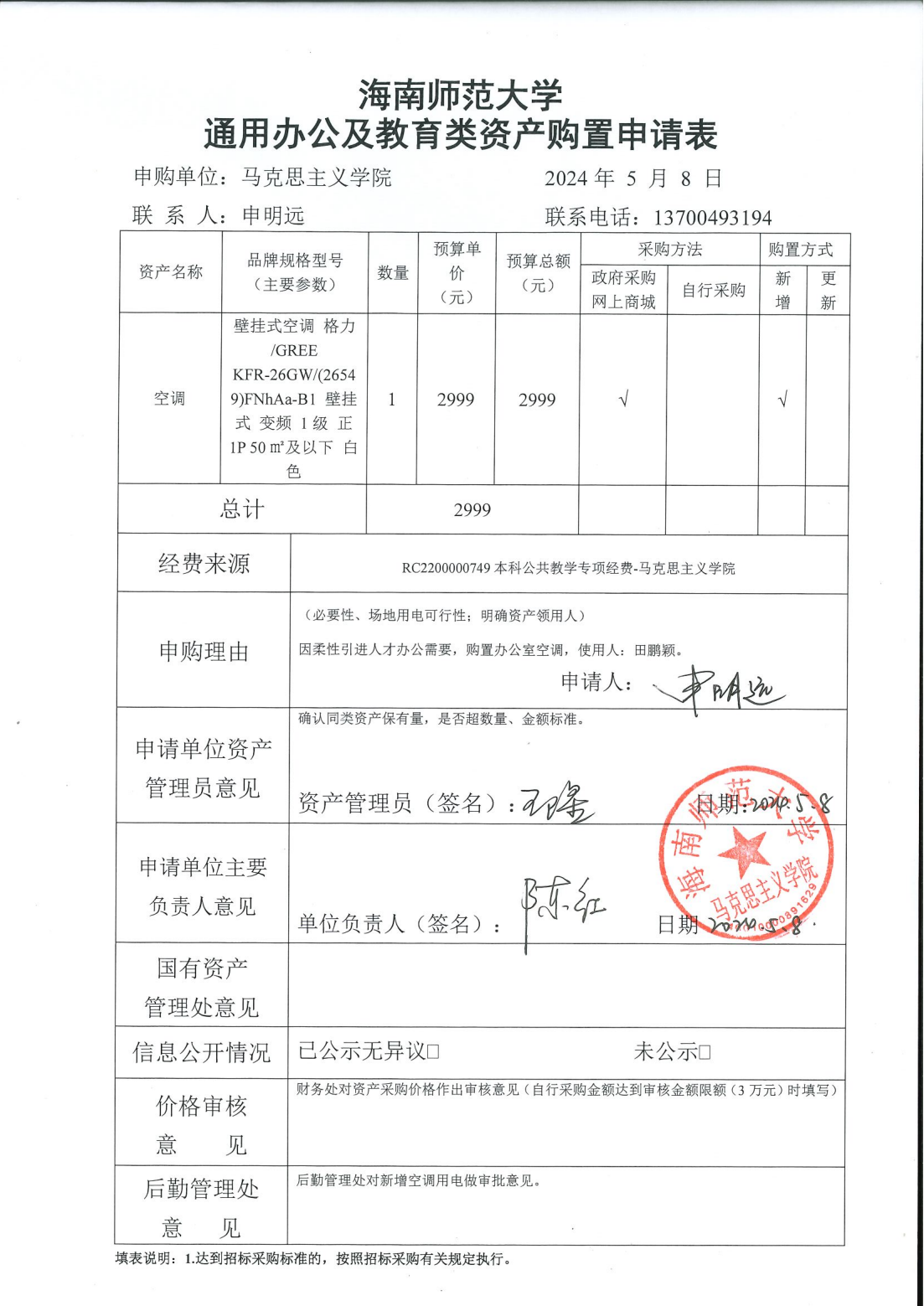 因马院建设需要,购置1台空调,按照学校固定资产采购要求,现予以信息公开。