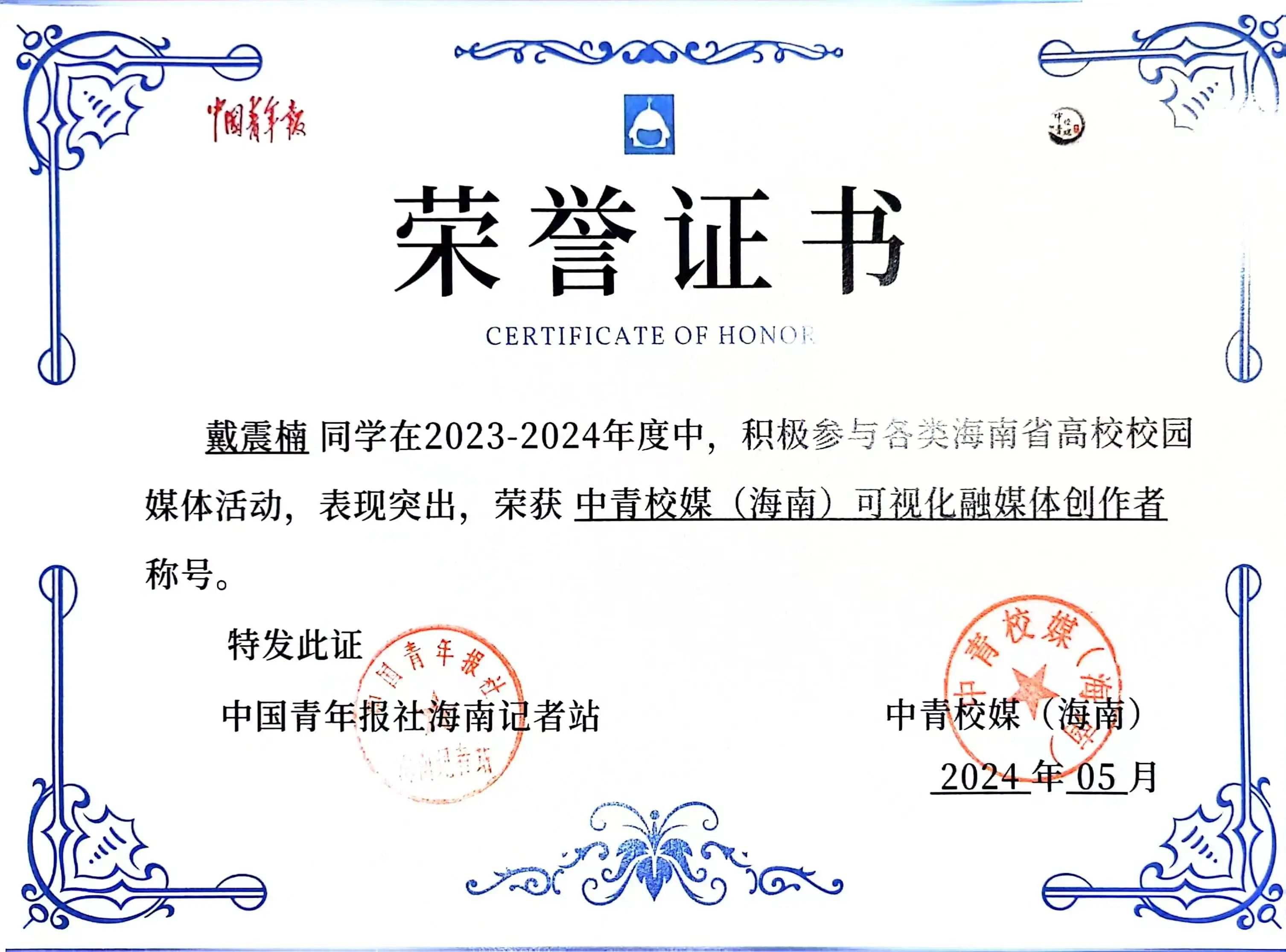 近日,在中国青年报社海南记者站指导、中青校媒(海南)主办的“2023-2024年度中青校媒(海南)年度可视化融媒体计划”活动中,我院“海师马院新青年”新媒体工作中心以优异的成绩,斩获“中青校媒(海南)可视化融媒体团队”称号;“海师马院新青年”新媒体工作中心学生负责人、马克思主义学院2021级思想政治教育班戴震楠获“中青校媒(海南)可视化融媒体创作者”称号。
