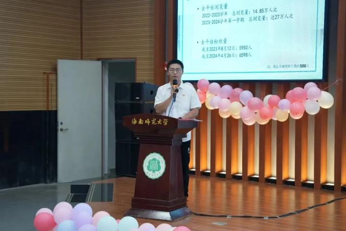 在5月12日举办的海南高校校园媒体交流会上,“海师马院新青年”新媒体工作中心学生负责人戴震楠进行了交流发言,主要围绕团队概况、获奖经历、平台特色、经验总结与未来规划等方面进行了分享,全方位展现了我院新媒体改革创新以来取得的成效,展现了我院新媒体团队不忘初心、砥砺前行的青春风貌。