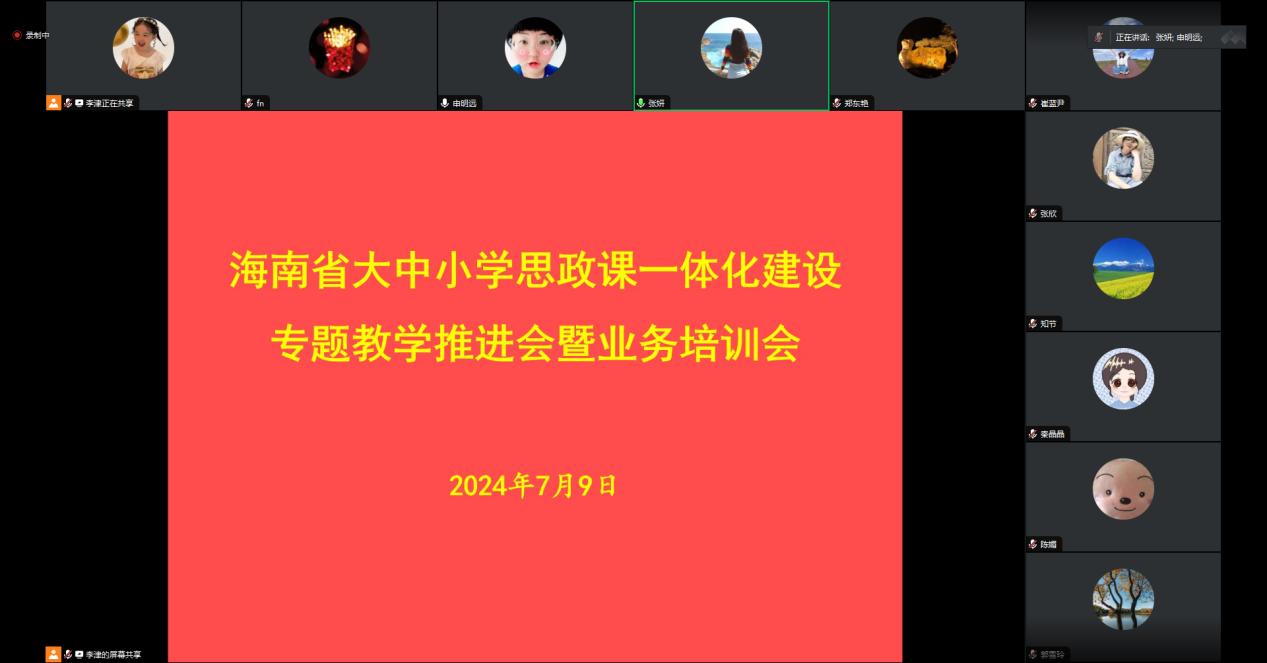 7月9日,马克思主义学院依托全国“大中小学思政课一体化共同体建设”牵头单位组织召开海南省大中小学思政课一体化专题教学推进会暨培训辅导会。来自海南热带海洋学院、琼台师范学院、海南中学、海南华侨中学等全省大中小学思政课教师代表50余人参会。会议由海南师范大学马克思主义学院副院长张妍主持。