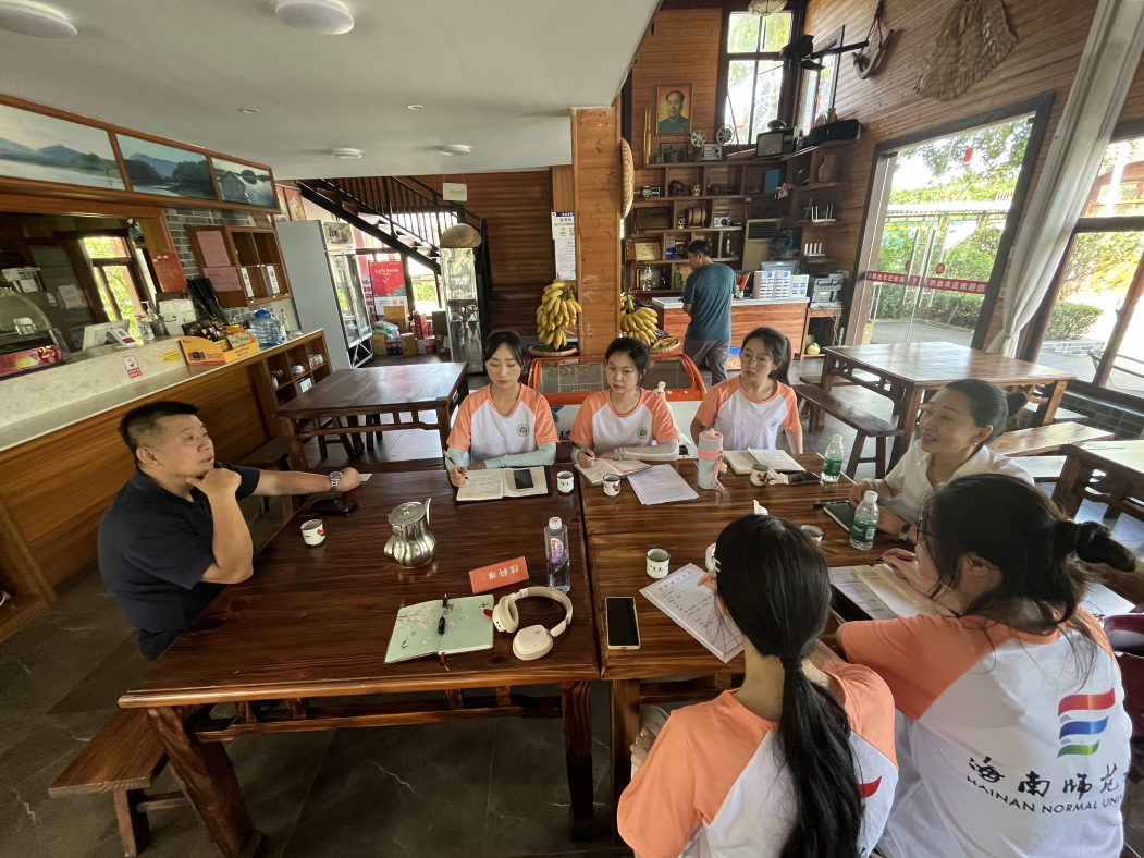 调研团成员与琼海市胜达集团董事长陈丁胜先生进行访谈。企业负责人陈丁胜先生详细介绍了目前农庄产业链融合的发展模式,以第一产业——种植业和养殖业作为根基,充分利用当地丰富的渔业资源和农业自然资源生产出品质优良、绿色天然的农产品,其销路遍布国内外,深受市场欢迎;以第二产业——农产品加工作为提升,与当地加工厂合作生产山柚油和咖啡;以“农业+旅游”“体育+旅游”“科普教育+旅游”的第三产业发展模式作为拓展,挖掘光耀村的农耕文化、红色文化、家风文化和科普教育文化,开发农事体验、研学基地、体育赛事等项目。