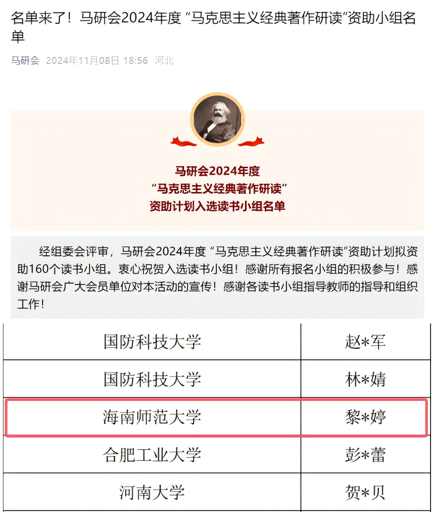 11月8日,中国高等教育学会马克思主义研究分会(以下简称马研会)发布了2024年度“马克思主义经典著作研读”资助计划入选读书小组名单。经组委会专家评审,由马克思主义学院申明远、刘荣指导的青年马克思主义研究协会《中国共产党的一百年》读书小组成功入选了该项资助计划。