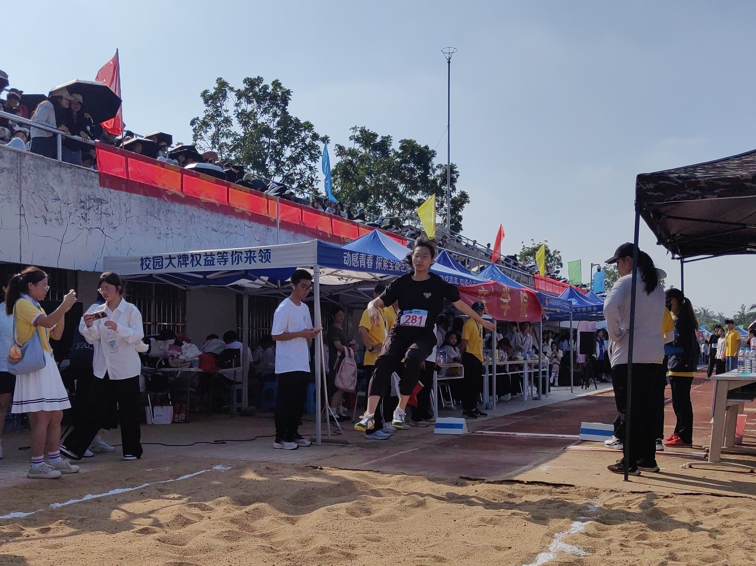 2022级小马青赖雪鸾取得了田赛女子甲组跳远第一名的好成绩。跳远现场,只见她迈出稳健而有力的步伐,如同展翅的雄鹰,那舒展又优美的身姿在空中划过一道亮丽的弧线,在落地前夕只见她收紧腿部,拼尽全力向前伸展,同时迅速摆动手臂借助力量向前冲去,如同一颗急速的流星冲入沙坑。