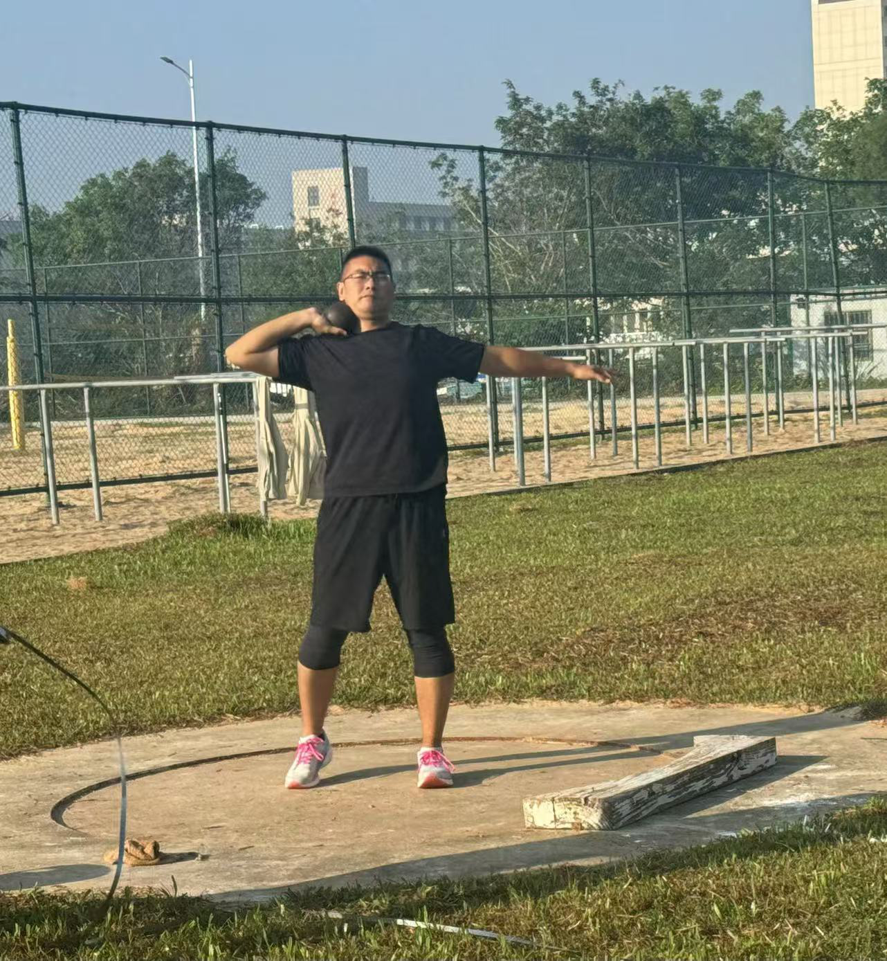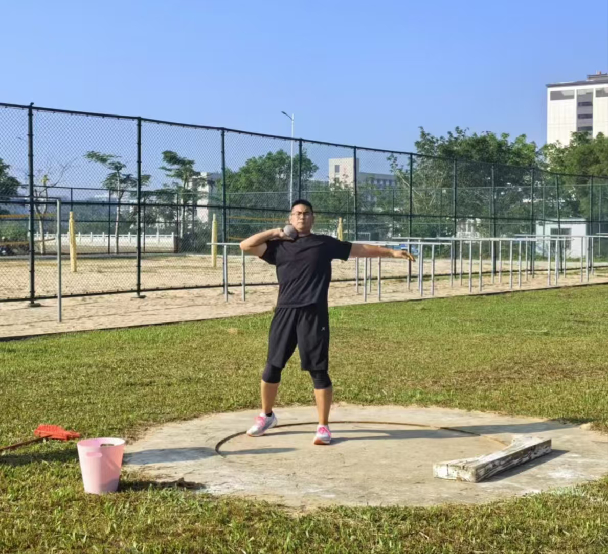 我院李超老师手拿铅球,铅球在他手中闪着光芒。挺直的臂膀,挥舞的手臂爆发出排山倒海的力量,一托一举一掷间,一道完美的弧线一闪而过,眼眸随它而动,沉重落地。“铅”钧一发,手中重球坚如磐石,