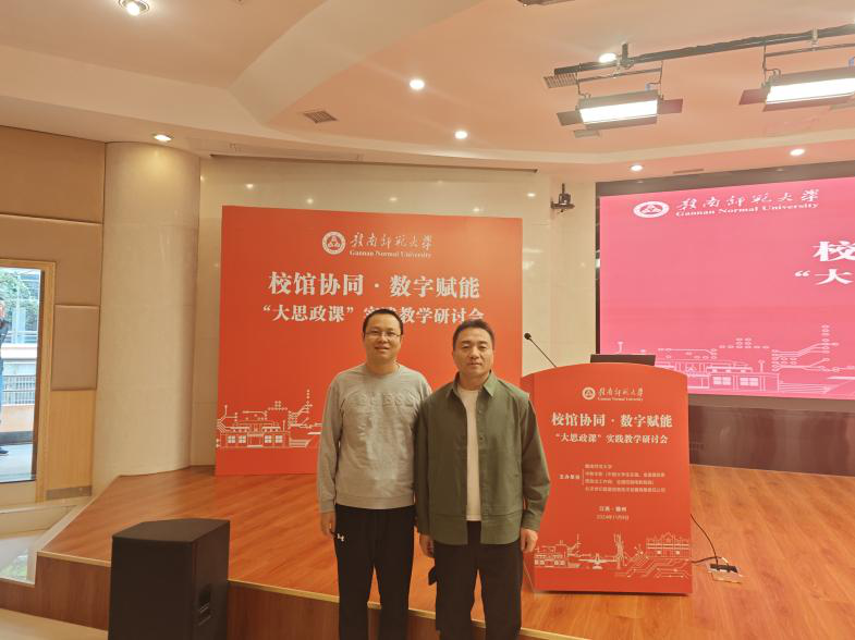 为深入学习贯彻党的二十届三中全会精神、全国教育大会精神,深化“大思政课”综合改革和质量建设,11月9日,由赣南师范大学、中教华影(中国大学生在线、全国高校思想政治工作网、“大思政课”实践教学发展研究中心、全国校园电影院线)、北京世纪超星信息技术发展有限责任公司联合主办的“校馆协同·数字赋能”大思政课实践教学研讨会在赣南师范大学图书馆科报厅举行。会议紧紧围绕“校馆协同·数字赋能——大思政课实践教学路径创新”主题进行教学研讨和案例交流,我院王睿、汤涛老师参加了此次会议。