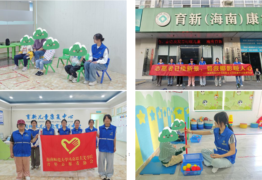 系列活动的最后一帧:志愿者们抵达海口雨润特殊儿童教育培训中心,为这里的小朋友们带来陪护与温暖。在这个充满爱的地方,志愿者以助教、陪护、感召为宗旨,进行课堂的辅助教学:社交与游戏课——辅助老师开展游戏,陪小朋友做捡球、丢圈游戏;生活技能课——帮助小朋友辨识常见蔬菜,培养他们的生活能力;奥尔夫音乐课——引导小朋友跟随音乐打拍子、做运动……这些课程活动的意义在于促进特殊儿童的身心发展,使其能够在社会的关爱下健康成长。