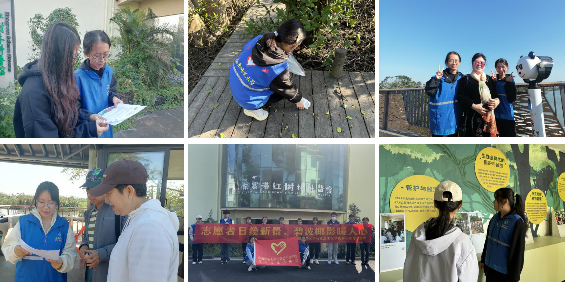 这是志愿者们这一学年来第一次走进东寨港红树林旅游区。在这里,志愿者们分工明确,兵分两路:一部分沿途拾起垃圾,并拿着宣传海报向来往的游客科普垃圾分类的知识;另一部分在馆内向游客介绍红树林内的珍稀植物和讲解红树林的重要作用。此次活动旨在帮助游客树立正确的环保意识,做文明旅游者,并引导游客了解红树林在生态系统中的重要作用。志愿者们通过多种多样的方式,为海南生态文明建设贡献了自己的青春力量。
