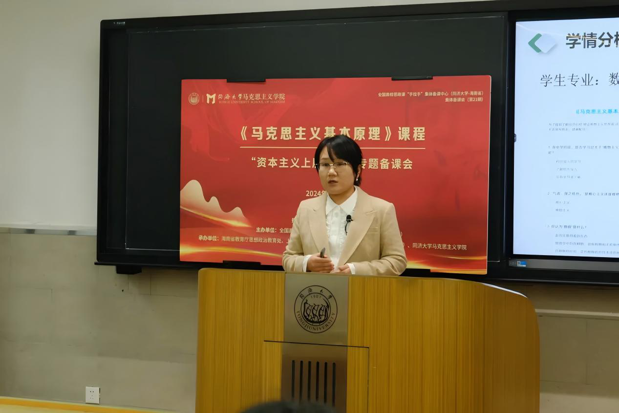 为深入学习贯彻习近平新时代中国特色社会主义思想和党的二十届三中全会精神,贯彻落实全国教育大会精神和新时代学校思政课建设推进会重要部署,守正创新推动思政课建设内涵式发展,全国高校思政课“手拉手”集体备课中心(同济大学-海南省)于2024年11月19日,在同济大学举办《马克思主义基本原理》“资本主义上层建筑”专题备课会,并在全国高校思政课“手拉手”集体备课中心(云上大练兵)同步直播。备课会由同济大学马克思主义学院马克思主义基本原理教研室主任周爱民老师主持,我院教师李丹丹参会。