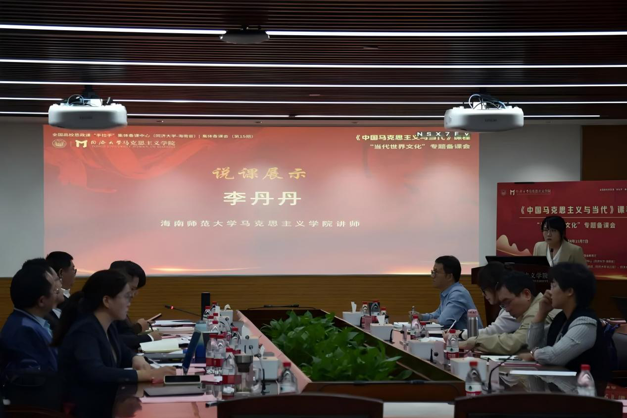 2024年11月7日,为深入学习贯彻习近平新时代中国特色社会主义思想和党的二十届三中全会精神,贯彻落实全国教育大会精神和新时代学校思政课建设推进会重要部署,守正创新推动思政课建设内涵式发展,全国高校思政课“手拉手”集体备课中心(同济大学-海南省)在同济大学举办《中国马克思主义与当代》课程“当代世界文化”专题备课会,并在全国高校思政课“手拉手”集体备课中心(云上大练兵)同步直播。同济大学马克思主义学院教研部主任、党支部书记姚莉萍副教授主持,我院教师李丹丹参会。