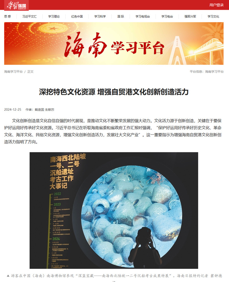 为学习宣传贯彻习近平总书记在听取海南省委和省政府工作汇报时强调的要“保护好运用好传承好历史文化、革命文化、海洋文化、民俗文化资源,增强文化创新创造活力,发展壮大文化产业。”的重要讲话精神,2024年12月25日《海南日报》(理论版)发表了我校党委委员、马克思主义学院教师戴逢国的理论阐释文章《深挖特色文化资源 增强自贸港文化创新创造活力》,《学习强国》海南学习平台进行了全文转载。