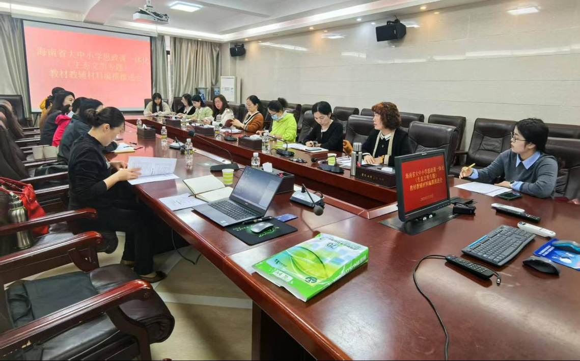 2025年2月23日下午,为推动海南省大中小学思政课一体化建设,提升思想政治教育质量,海南省大中小学思政课一体化丛书(生态文明专题)编撰推进会在海南师范大学第一办公大楼一楼会议室顺利召开。本次丛书的编撰受到了海南省教育厅思政处(教材处)、海南出版社的大力支持。本次会议特邀海南出版社教育分社副总编辑桂书方作为顾问指导,来自海南省范围内的大中小学段16位思政课教师骨干作为代表参会共同研讨。