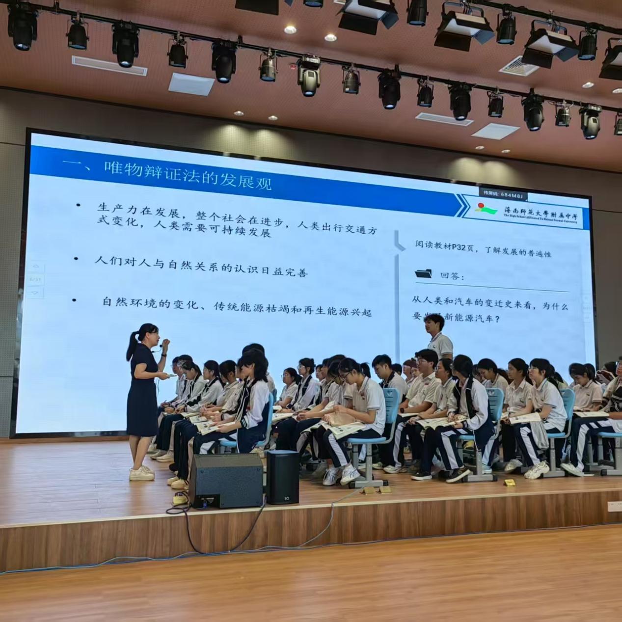 在高一年级《世界是永恒发展的》课堂上,文玉霞老师以“汽车发展史”视频导入,结合消博会车展创设议题情境,引导学生从哲学视角分析科技创新的辩证关系。课堂尾声,学生用“发展观”解读自贸港建设案例,实现了理论与实践的有机统一。