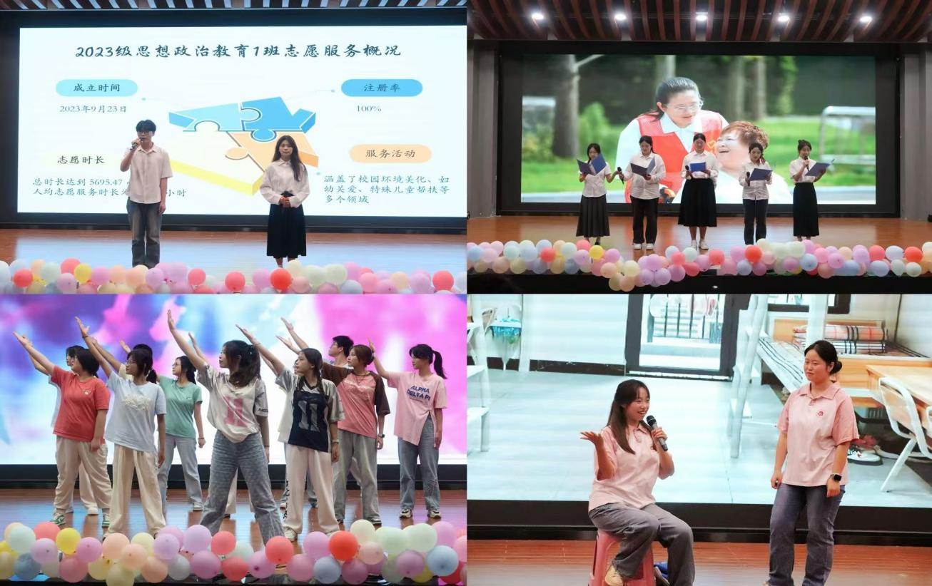 随后,2024级思想政治教育1、2班团支部和2023级思想政治教育1、2班团支部带来了精彩的汇报演出,其中2024级思想政治教育1、2班团支部以新闻联播的方式和简洁明了的手势舞赞扬了奉献社会、互助进步的志愿者精神。2023级思想政治教育1、2班团支部则通过幽默风趣的情景剧和暖心的大合唱等方式表现了志愿者们躬身力行、奉献担当的美好品德。除此之外,未知名乐队用激昂旋律嗨翻全场;游戏环节充满悬念,现场欢笑与喝彩交织,为文化节增添别样活力。