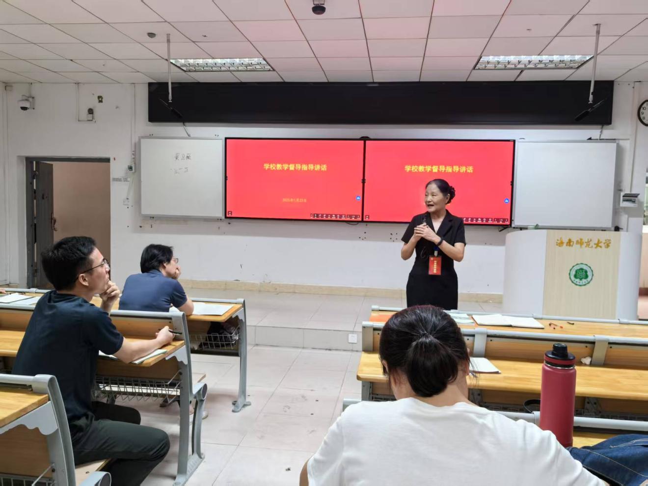 会议第二阶段,召开马克思主义学院2024-2025学年度第二学期教学工作会议。学院副院长张妍领学了学校近期印发的《海南师范大学本科教学事故认定及处理办法》,并强调,思政课是落实立德树人根本任务的关键课程,思政课教师应扎根课堂,守好一段渠、种好责任田,进一步维护教学秩序,规范教学行为,有效预防和处理教学工作中各项事务,加强学习,严于律己,避免教学事故的发生。