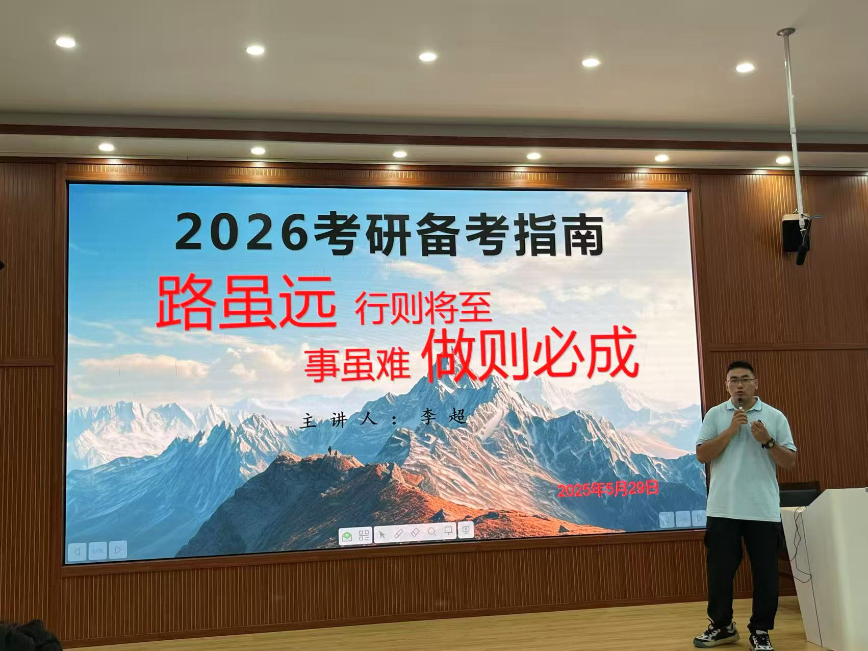会议最后,李超老师结合自身经验,鼓励同学们坚定信心,合理规划时间,保持积极心态,全身心投入备考。本次考研备考辅导会内容丰富、针对性强,为非毕业班同学提供了全面的考研信息和实用的备考建议,帮助同学们明晰了考研方向,增强了备考信心。相信在学院老师的悉心指导和同学们的不懈努力下,2026届考研学子定能不负韶华,实现梦想。