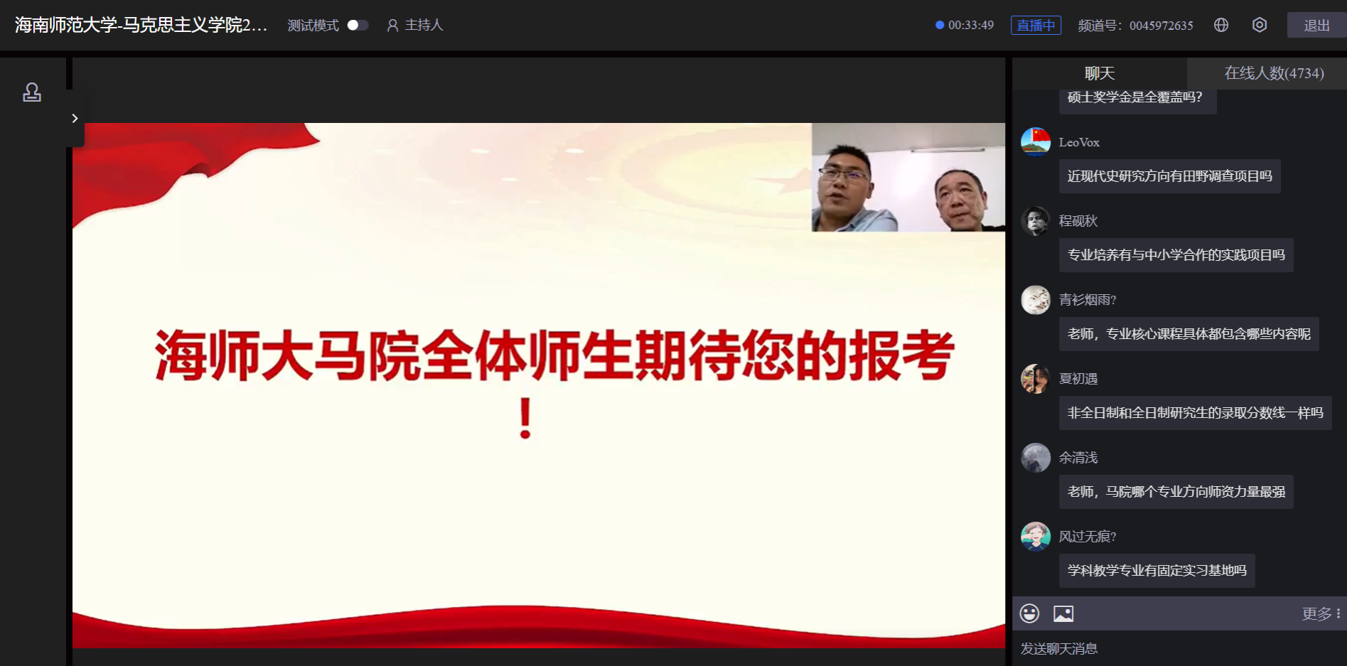 2025年6月26日15:00-16:00,海南师范大学马克思主义学院在中国教育平台在线举办了2026年硕士研究生招生宣讲直播,直播由学院副院长丁匡一教授主讲。