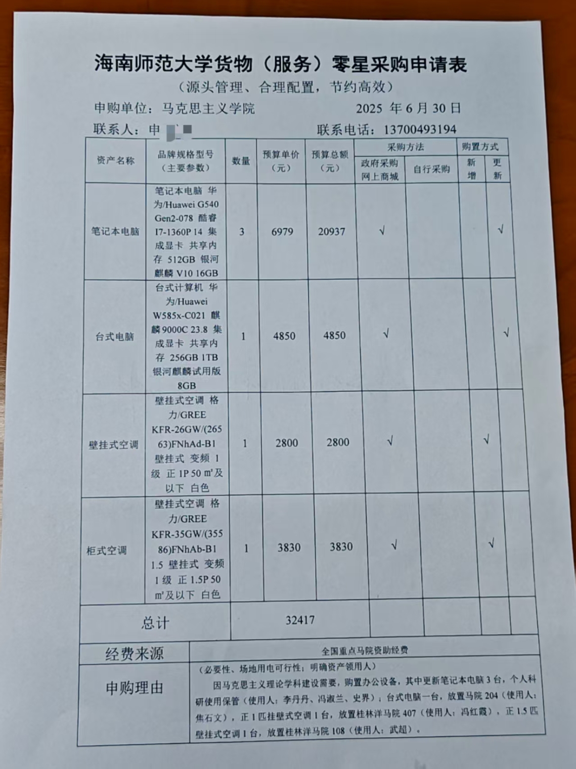 因马克思主义理论学科建设需要,购置办公设备,其中笔记本电脑3台(使用人:李丹丹、冯淑兰、史界),台式电脑1台放置马院204办公室,(使用人:焦石文),正1匹壁挂式空调1台放置马院407录播室(使用人:冯红霞),正1.5匹壁挂式空调1台放置马院108办公室(使用人:武超)