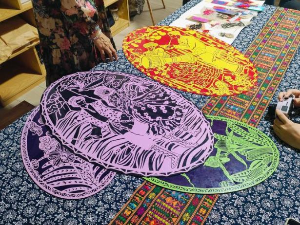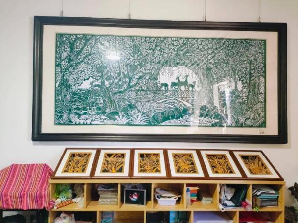 调研伊始,黄海桃大师系统梳理了剪纸艺术源远流长的发展脉络与精湛绝伦的创作技艺,分享了她数十年如一日在传承中创新、在创新中坚守的深刻感悟。工作室陈列的作品,正是匠心独运与时代精神交融的结晶。其中,以海南本土文化为底蕴进行创造性转化的系列作品,以及象征民族大团结的“五十六个民族”主题巨制尤为震撼人心,生动诠释了非物质文化遗产“保护为主、抢救第一、合理利用、传承发展”的核心理念,彰显了在守正创新中焕发非遗生机的强大力量。