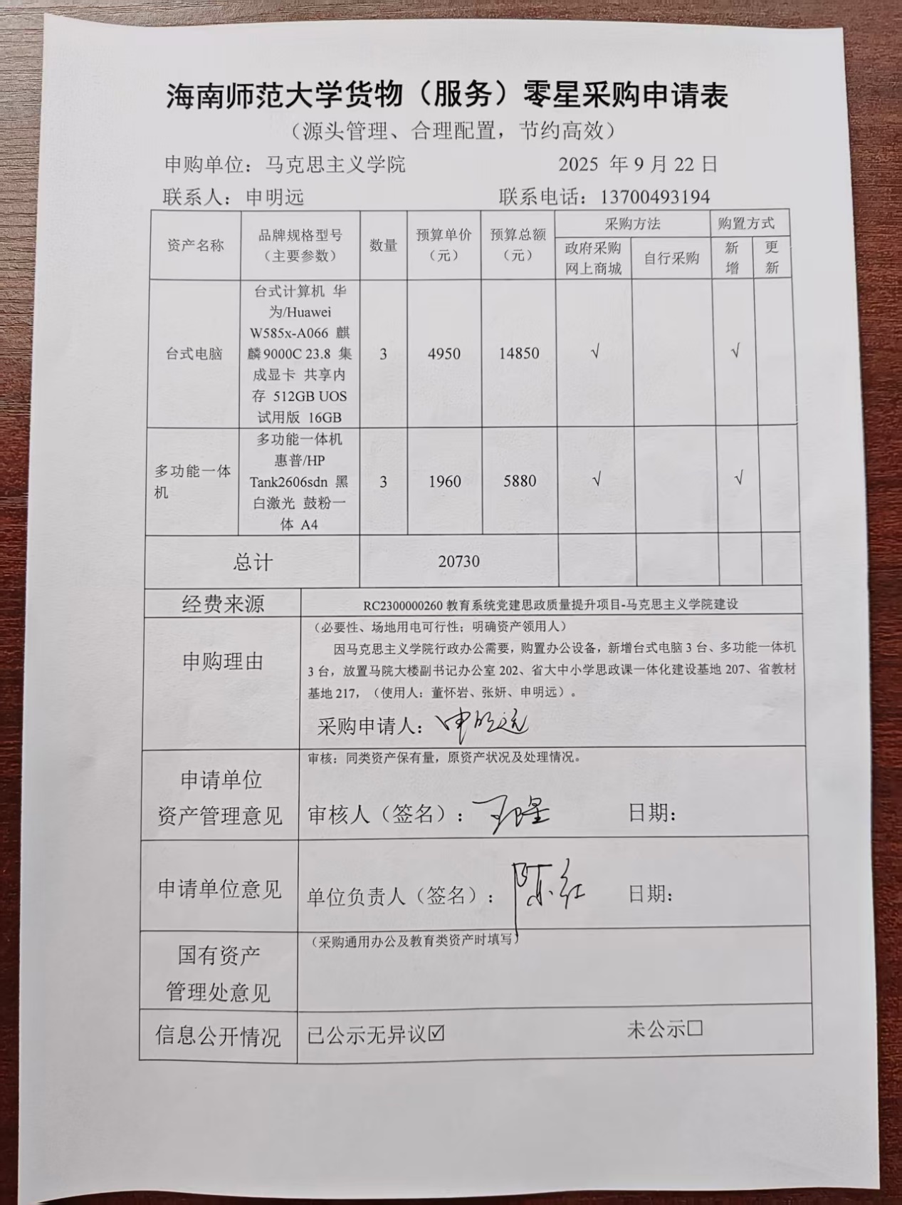 因马克思主义学院行政办公需要,购置办公设备,新增台式电脑3台、多功能一体机3台,放置马院大楼副书记办公室202、省大中小学思政课一体化建设基地207、省教材基地217,(使用人:董怀岩、张妍、申明远)。