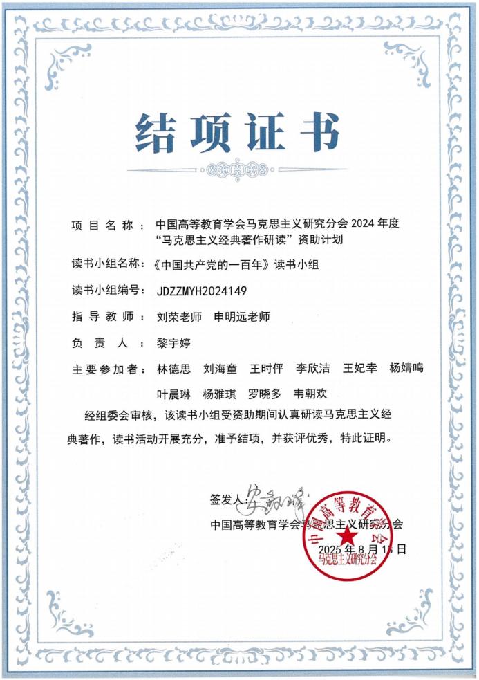 海南师范大学《中国共产党的一百年》读书小组结项证书
