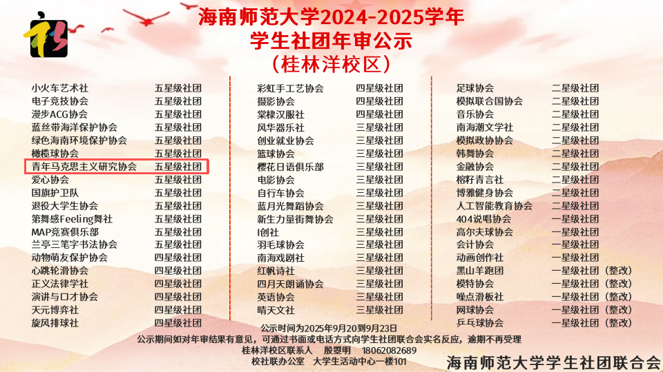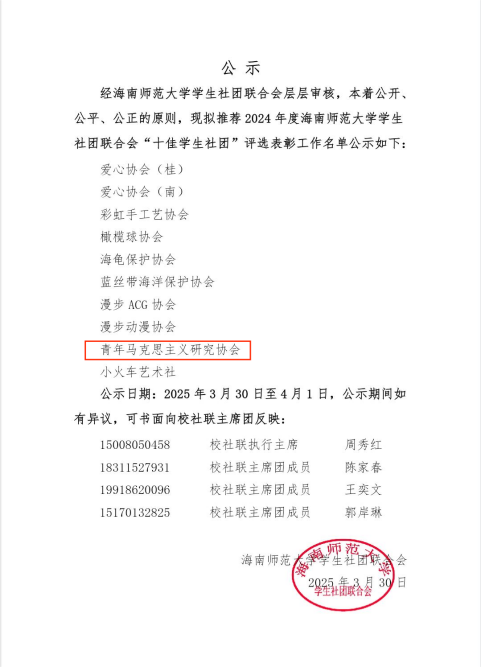 海南师范大学青年马克思主义研究协会(简称“青马协会”)在2024-2025学年学生社团年审中,凭借扎实的理论学习、丰富的实践活动与突出的思想引领成效,再次获评五星级社团!这是协会持续深耕、接续奋斗的又一重要成果,更是校团委、学生社团联合会对青马协会年度工作的高度认可。