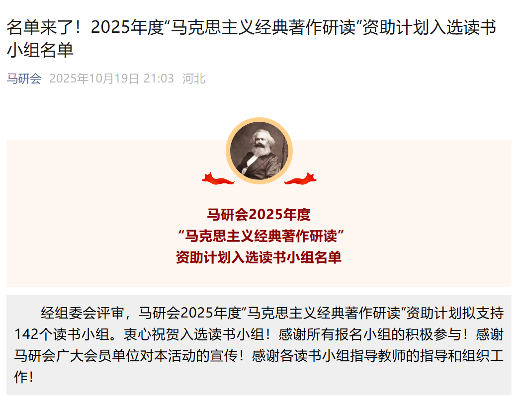 10月19日,中国高等教育学会马克思主义研究分会(以下简称马研会)发布了2025年度“马克思主义经典著作研读”资助计划入选读书小组名单。经组委会专家的严格评审,由申明远、郑伟民老师指导的青年马克思主义研究协会“海马青年《习近平谈治国理政》读书小组”成功入选了该项资助计划,这是继2024年协会入选优秀结项后再次入选。