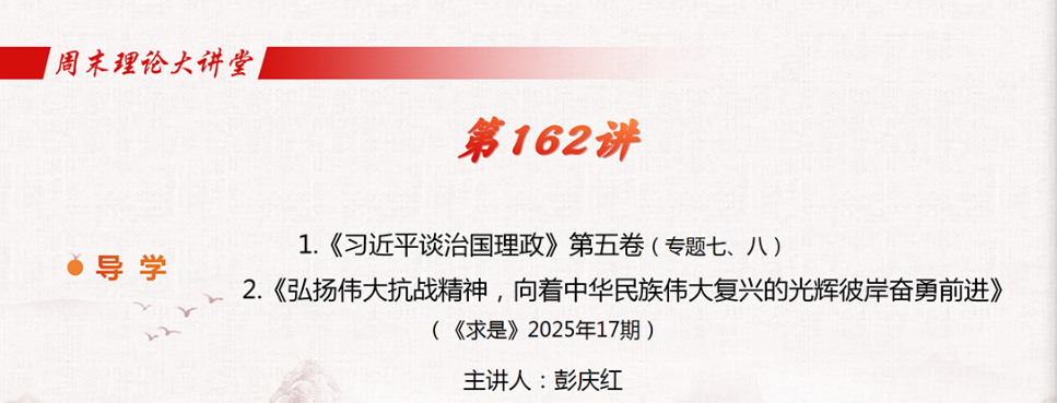 会议开始,全体教师首先学习了周末理论大讲堂专题导学,由彭庆红教授导读《习近平谈治国理政》第五卷(专题七、八)和《弘扬伟大抗战精神,向着中华民族伟大复兴的光辉彼岸奋勇前进》。