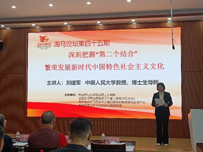 2025年11月29日下午,应海南师范大学马克思主义学院邀请,中国人民大学马克思主义学院二级教授、中央实施马克思主义理论研究和建设工程首席专家、“万人工程”哲学社会科学领军人才入选者、教育部“长江学者”特聘教授刘建军,在马克思主义学院201报告厅作了题为《深刻把握“第二个结合”繁荣发展新时代中国特色社会主义文化》的学术讲座。学院百余名师生参会,讲座由马克思主义学院院长、博士生导师陈红主持。