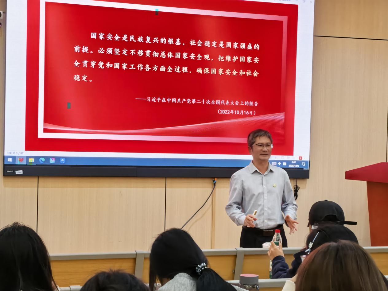 在授课过程中,杨兹举副校长结合学生所学专业,用鲜活的案例、翔实的数据和生动的语言,启发学生思考,引导大学生增强维护国家安全的意识,以实际行动维护国家安全。