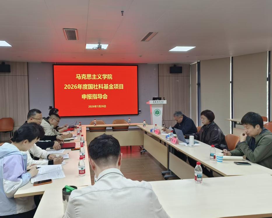 2026年1月26日上午,我院在龙昆南校区图书馆二楼会议室举行第七轮国家社科基金项目申报指导会。学院特邀江西师范大学副校长周利生教授莅临指导,学院院长陈红主持会议,拟申报2026年度国社科基金项目的教师参会。
