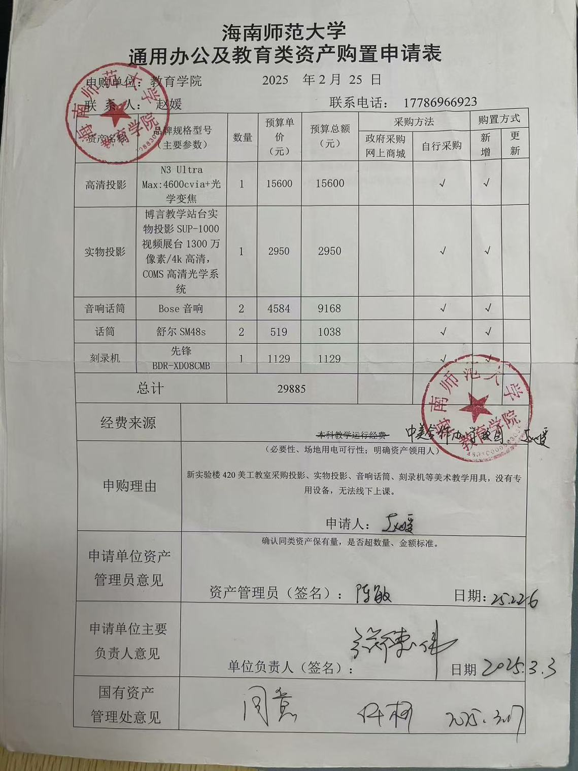 海南师范大学教育学院申请采购以下设备,根据学校相关规定,对购置物品进行公示如下,公示时间为3月3日-5日,如有异议请拨打电话:65889325。