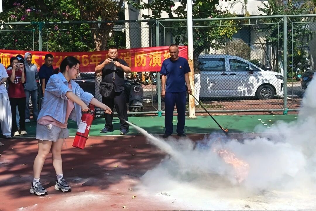随着紧急疏散警报响起,演练正式进入实战环节。参演学生在老师指挥下,按照"2楼先撤、逐层跟进"的原则,沿指定消防通道快速有序撤离。现场贯彻"学生优先、教师断后"原则,全程保持安静、避免拥挤,100余名师生在规定时间内全部安全疏散至指定集结点,展现出良好的应急响应水平。疏散演练结束后,保卫处工作人员现场演示干粉灭火器"提、拔、握、压"操作要领,并组织学生分批进行灭火实操。同学们踊跃参与,在专业人员指导下亲身体验初期火灾扑救,切实掌握消防器材使用技能,实现从"理论认知"到"实践掌握"的跨越。