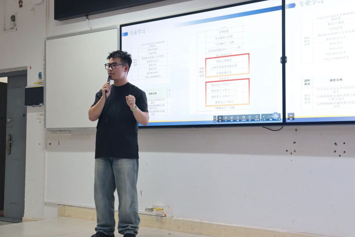在交流分享环节,王瑞浦学长结合自身成长经历,从三大维度为新生倾囊相授:深耕学院沃土,筑牢学业根基。他回忆起自己的校园时光,对照现行人才培养方案,细致拆解大学四年学习规划,分享高效学习方法与课程备考技巧,有效缓解了新生的入学适应焦虑,帮助大家清晰梳理学业发展路径。密织社会信息网,明晰职业方向。结合心理学专业就业前景与自身职场经历,他从简历制作、面试技巧、职场适应等方面分享实用经验,为新生提前规划职业发展提供满满干货,让大家对未来就业方向有了更具象的认知。践行师者使命,传递专业温度。作为高中班主任兼心理教师,他讲述了自己在教育一线的工作故事,展现心理学在基础教育领域的应用价值,让新生直观感受到专业使命与责任,也为大家树立了职业发展榜样。