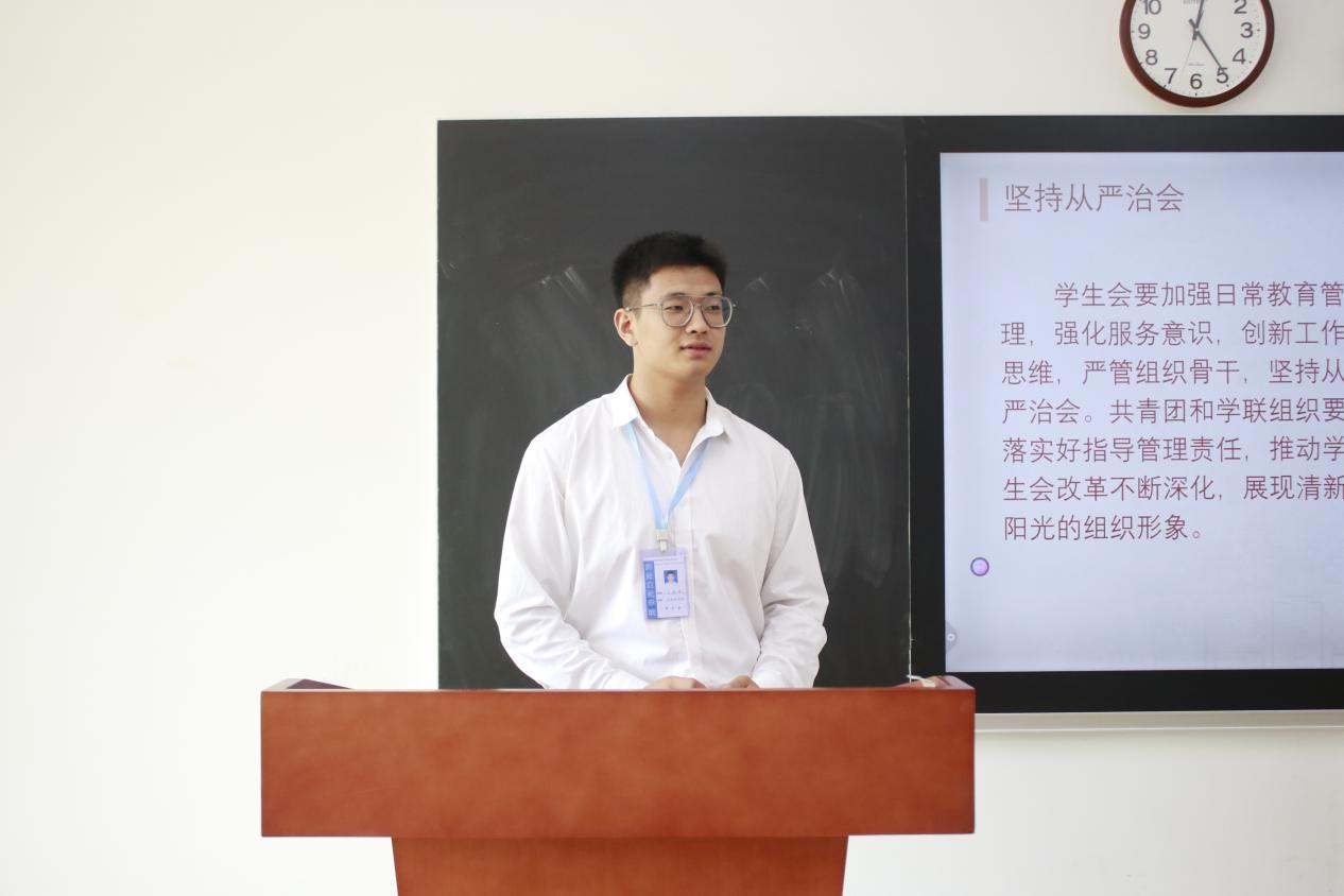 随后,由学生会主席团成员许峻玮同学带领各学生干部学习了《关于推动高校学生会深化改革的若干意见》。许峻玮同学提到:在座的各位学生干部今后要继续强化政治引领方向,改善工作作风,培养学生干部的服务意识,坚持从严治会。并要求各学生干部从心底增强对学院与学生会的认同感,维护组织和谐氛围,主动为同学们服务,树立我院学生会清朗的形象。此外,许峻玮同学还指出,学生会的进步不是个人的进步而是集体的进步,需要学生会各位学生干部共同为之努力奋斗,始终保持“日拱一卒,月进一步”的刻苦精神,践行“全心全意为同学们服务”的工作宗旨,同广大青年学生一道,在矢志奋斗中谱写新时代的青春之歌。