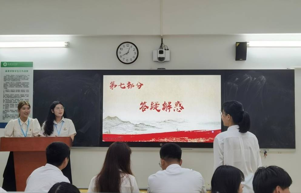 会议第七项,答疑解惑。团委副书记、组织部部长与副部长对各团支部提出的疑问进行一一解答。各团支部积极发问,提出了新想法、新建议,组织部部长与副部长耐心解答,积极鼓励,进一步加深各团支部对于本次主题团日活动的理解、认识。