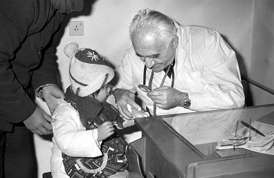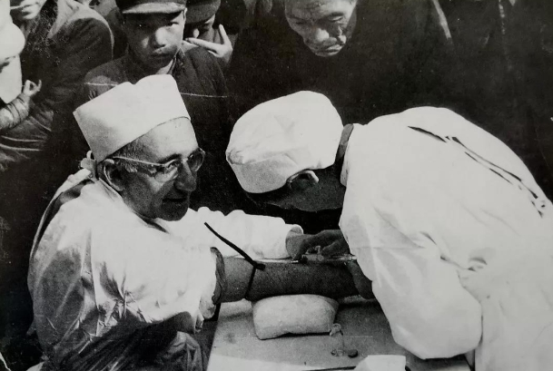 (医疗队初到边远地区时,那里的群众不敢抽血检查,马海德亲自给牧民们作抽血示范)