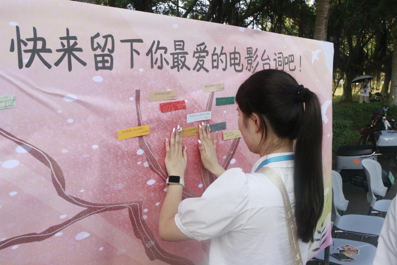 大家在趣味游戏中品味红色电影的魅力,我院工作人员的耐心引导与现场热闹的氛围不断吸引着现场人群参与我院的活动当中。在这两个趣味游戏之外,历史文化学院与外国语学院还联合布置了“万影树”:参与者可写下自己喜欢的电影台词作为树叶,数句电影台词汇聚在一起,构成一棵完整的“树”。随着参与者越来越多,这棵“树”也变得越来越茂盛,这份特殊的浪漫触动着路人的心弦。