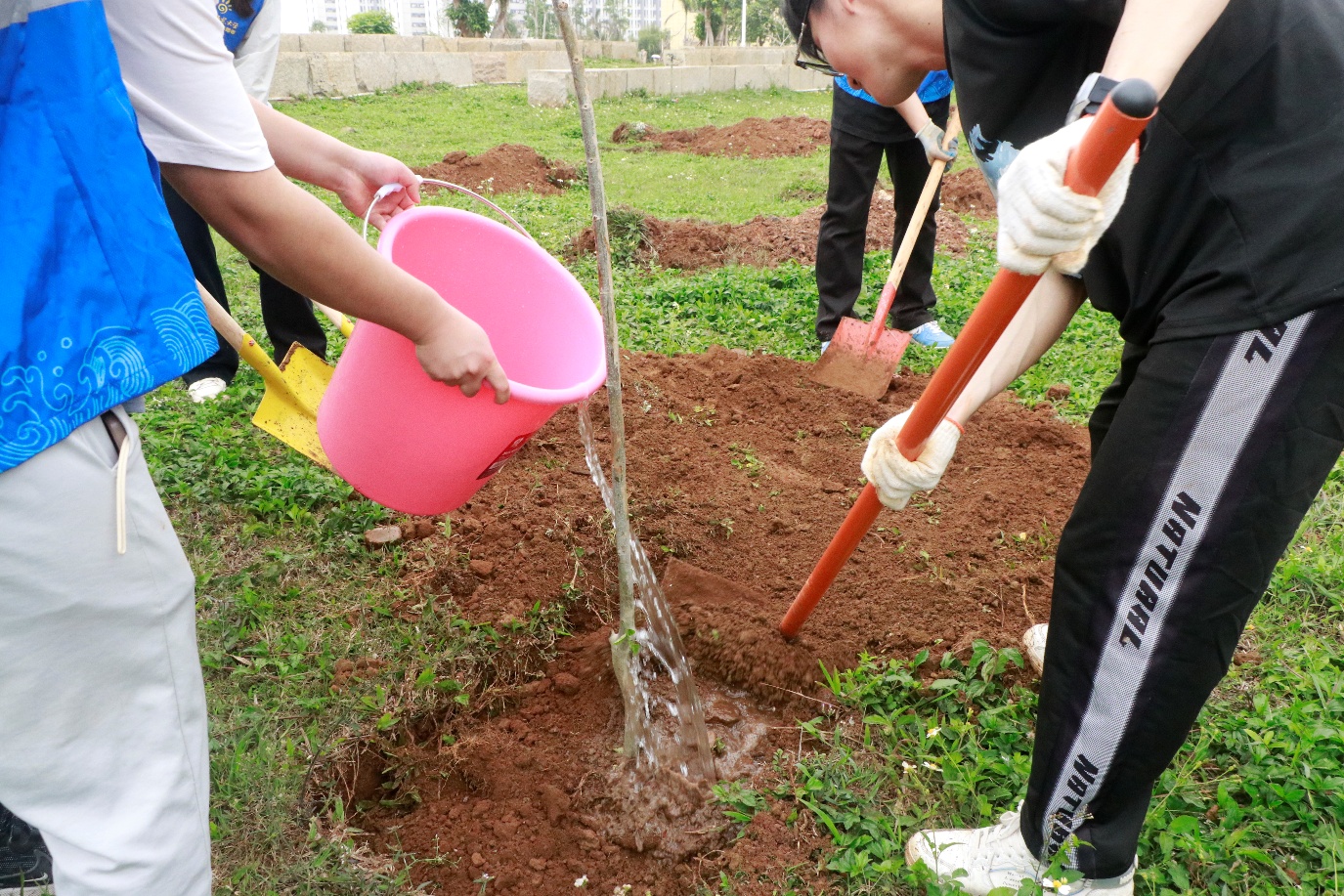 “植”此青绿,共“树”春晖。活动开幕后,老师们以身作则率先拿起铁锹开始了植树前的准备工作。同学们也不甘示弱,他们分工合作、步调一致。有人挖坑刨土,有人扶正树苗,还有人提桶浇水,充分展现出了历史文化学院团结协作的精神。生扶苗,师填土,师生默契配合,共同在这个春天种下一个又一个希望。尽管后来天空飘起了雨丝,但是大家丝毫没有受天气影响,依旧热情高涨更加卖力地投入劳动中。