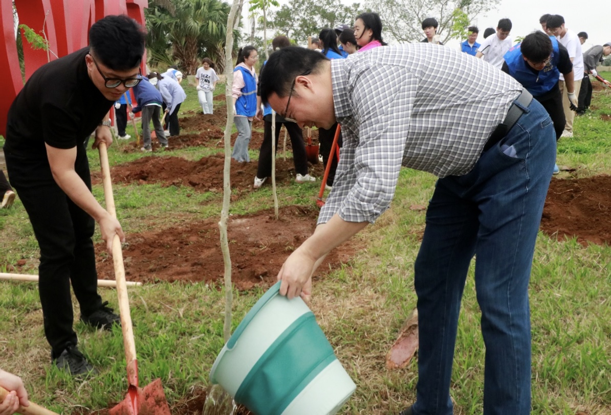 为深入学习贯彻习近平生态文明思想,牢固树立和践行现代化生态文明理念,培养师生劳动精神和奉献精神,巩固学校全国文明校园建设成果,推进形成“植绿、爱绿、护绿、兴绿”的良好风气,海南师范大学于2025年3月12日9点整于桂林洋校区大学生活动中心门口举办了植树活动,历史文化学院党委书记王志强老师、党委副书记王国英老师、学工办主任郭雷鸣老师以及辅导员伊鑫迪老师带领24级历史三班全体同学积极响应学校号召并顺利完成植树任务。