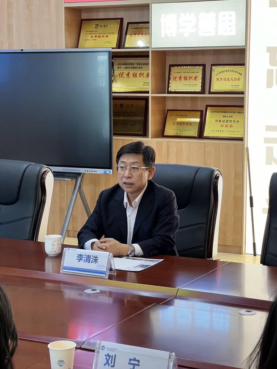 上海世外附属海口学校校长李清洙向武刚等一行人的到来表示热烈欢迎,并简要介绍学校发展、招聘岗位情况等,也提出人才培养的建议和平台共建的意愿,希望双方能够深化合作,为海南基础教育事业的发展作出贡献。